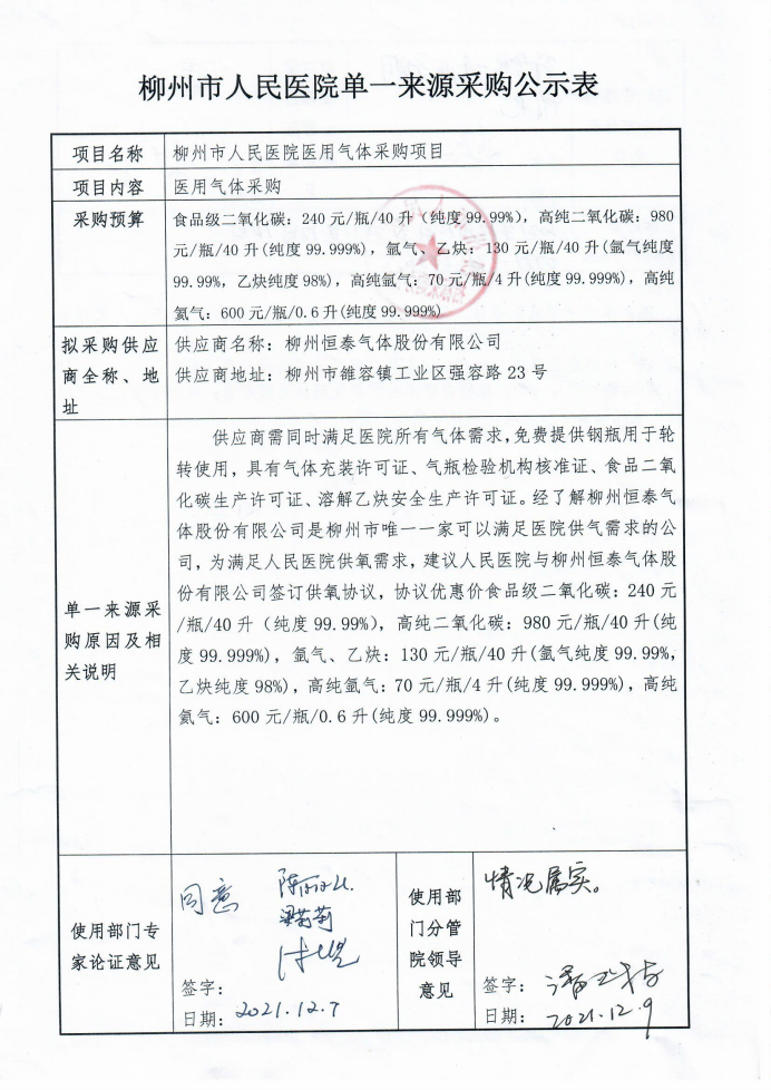 柳州市人民醫院醫用氣體單一來源采購項目公示