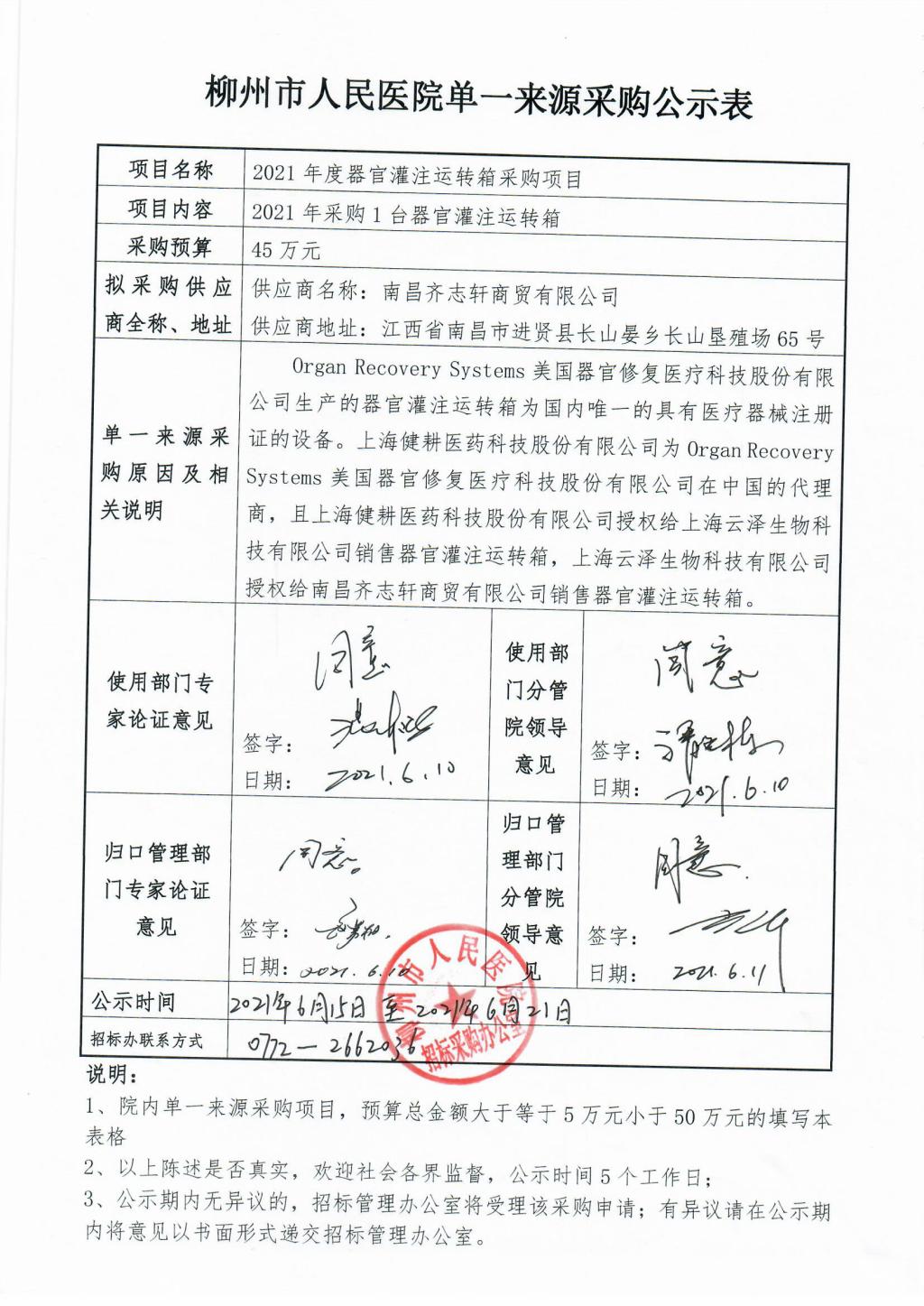 柳州市人民醫(yī)院2021年度器官灌注運(yùn)轉(zhuǎn)箱單一來源采購項(xiàng)目公示