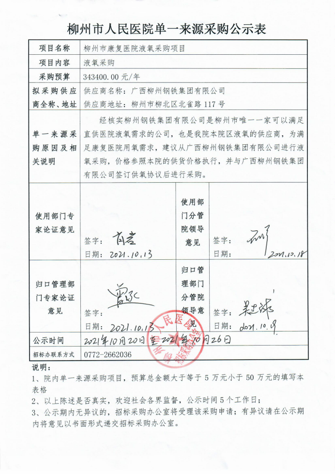 柳州市人民醫(yī)院柳州市康復(fù)醫(yī)院液氧單一來源采購項(xiàng)目掛網(wǎng)公示