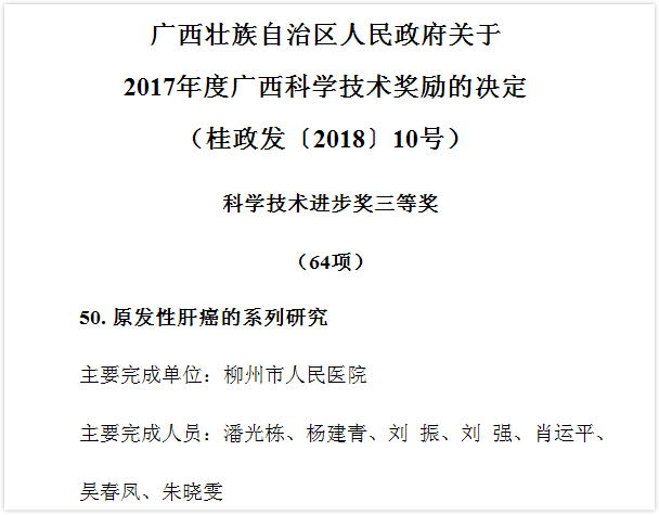 近日,為深入貫徹黨的十九大精神,大力實施科教興桂戰略、人才強桂戰略和創新驅動發展戰略,自治區人民政府決定對148項技術水平高、經濟社會效益好的科技成果完成單位和人員進行獎勵。經組織推薦、評審和嚴格審核、公示,柳州市肝膽胰疾病防治人才小高地、柳州市人民醫院肝膽胰外科團隊所完成的研究成果《原發性肝癌的系列研究》榮獲廣西科技進步獎三等獎,這是柳州市衛生系統唯一獲此殊榮的項目,也意味著我院在肝癌方面的研究處于柳州市的領先地位。