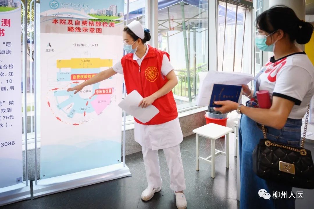 這時,一位需要自費核酸檢測的患者家屬正發愁不知如何辦理,她著急的樣子引起了梁娟的注意。梁娟了解情況后,安慰這位家屬并耐心地告知自費核酸檢測的流程。此時,梁娟忽然想到,自費核酸檢測需要從自費核酸檢測入口才能進入,該入口需要先走出醫院門診大廳才能找到,想著患者家屬對醫院的地理位置不熟悉,梁娟靈機一動,主動利用身后的大樓平面圖給這位家屬進行耐心地指引:“您現在所在位置在這,您需要走出醫院門診的大門,往您的右手邊拐彎,順著我們這棟樓的形狀走半圈,就能看到入口了,我這樣告訴您,您能明白嗎?”“我明白了,清楚清楚!”患者家屬激動地回答。“那請帶上您的身份證和患者的就診卡,那邊會有醫生給您開單子采核酸的。”梁娟的指引清晰且溫和,詳細地為患者家屬指引了方向,讓這位家屬感激不盡,一直夸獎柳州市人民醫院不僅技術水平高,服務態度也很棒!“人民醫院為人民”的良好形象在梁娟身上再一次得到了彰顯。