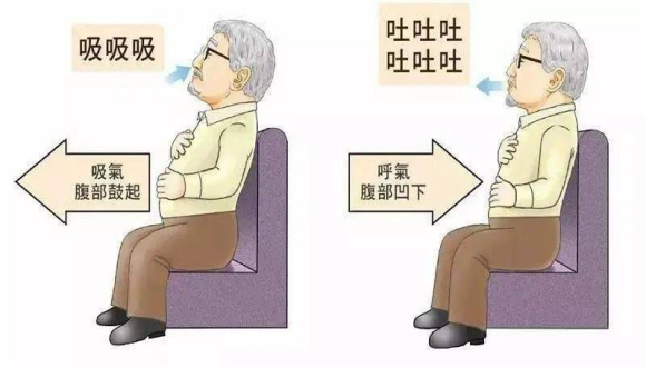 1.腹式呼吸:經鼻吸氣,從口呼氣,吸氣時上腹部鼓起,呼氣時腹部凹陷,上胸廓保持最小活動幅度或不動。每次5-10次,每天1-2次。