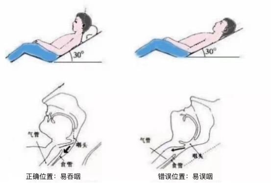 ⑵不能坐起來的患者,一般至少采用30?半臥位;頭部稍前屈,健側吞咽。禁忌平躺位進食。