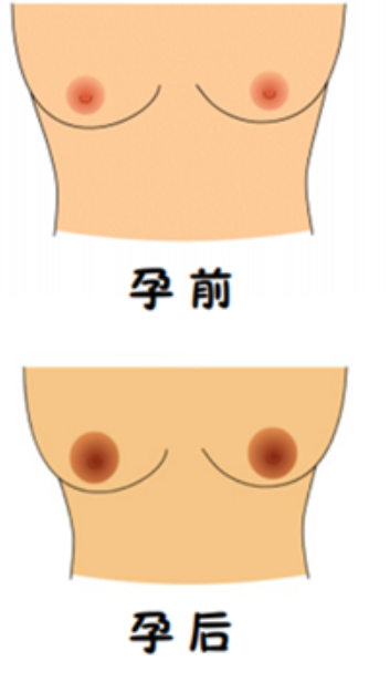 在激素作用下乳暈顏色可能會變深,乳暈上的小突起(即蒙哥馬利腺)會變得明顯。初生寶寶視力有限,僅能分辨黑白色,乳暈顏色加深可以更好地引導寶寶找到乳頭。同時,蒙哥馬利腺能散發出類似羊水的氣味,指引寶寶自主尋找到媽媽的乳房,完成第一次哺乳。是不是很神奇呀!