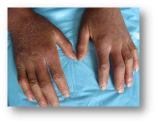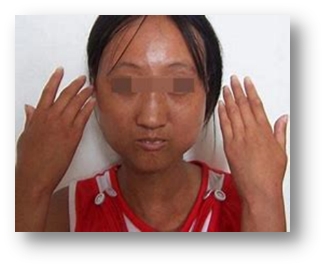 屬于系統性硬化癥的標志性損害。受連累部位:最先累及雙手、面部,逐漸累及前臂、頸部、軀干,呈現對稱性。表現:可逐漸出現皮膚腫脹及硬化,面部出現典型“假面具臉”,即面部缺乏表情、彌漫性色素沉著、皺紋減少、張口受限等,同時可伴有皮膚色素改變,包括色素沉著或色素脫失。