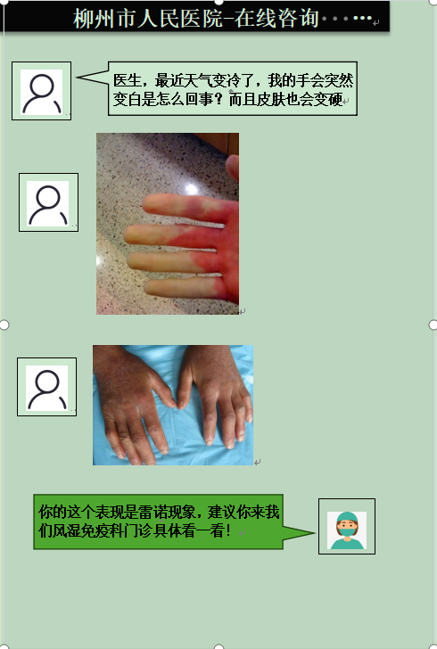 典型表現為遇冷或情緒激動時手指(足趾)皮膚先變白,隨后變紫,再變紅。可出現在一個或多個手指,變色與正常區域常常有明顯的分界線,同時可伴有疼痛、麻木等不適。約70%的患者為首發癥狀,達90%的患者病程中出現雷諾現象。