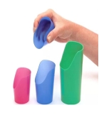喂食用的勺子最好是勺底淺、容量約5-10ml的長炳匙,適合舌后送食物困難者。喝水用上緣有一缺口的“斜口杯”,只需抬高杯子喝完杯內(nèi)水,避免嗆咳。