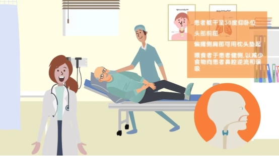 (1)不能坐起的患者,抬高床頭30-60度,頭部肩部墊枕頭,頭偏向健側(cè),喂食者在健側(cè)協(xié)助喂食。