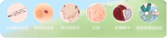 (二)有高熱、頭痛、皮膚焦痂和潰瘍、局部淋巴結腫大、皮疹、肝脾腫大等癥狀時,及時就醫。