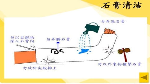 6.石膏固定后要注意個(gè)人衛(wèi)生、保持清潔,石膏表面臟了,可用軟毛巾蘸肥皂及清水擦拭,但不要浸濕石膏。如果石膏濕了或有嚴(yán)重污染的,及時(shí)到院更換。
