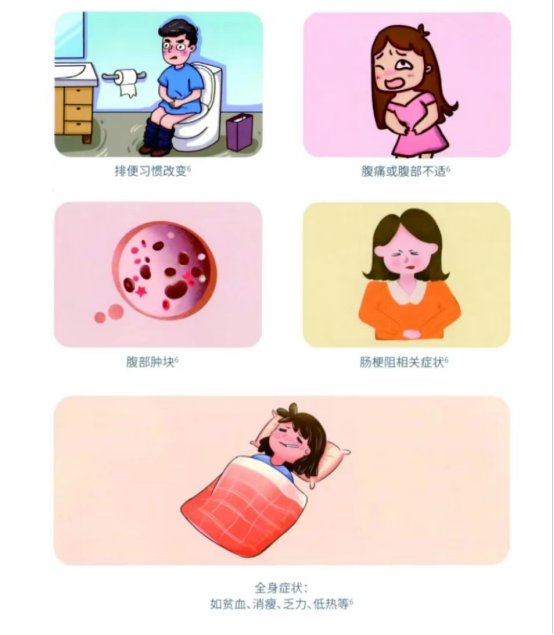 早期結直腸癌可無明顯癥狀,病情發展到一定程度可出現下列癥狀:排便習慣改變、大便性狀改變(變細、血便、黏液便等)、腹痛或腹部不適、腹部腫塊、腸梗阻相關癥狀、全身癥狀:如貧血、消瘦、乏力、低熱等。