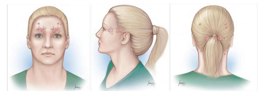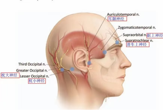 偏頭痛發作時,往往伴隨著劇烈的搏動性疼痛,偏頭痛常見的疼痛部位主要集中在額部、顳部、鼻部及枕部等4個部位。相應的頭皮神經受到卡壓,觸發偏頭痛的發生額部(眶上神經和滑車上神經)、顳部(耳顳神經和三叉神經顴顳支)、鼻眼(鼻腔)、枕部(大神經、枕小神經、第三枕神經)。