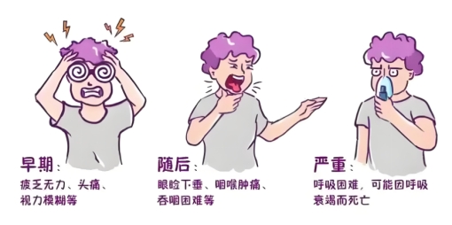重度癥狀:在上述癥狀的基礎上,還可出現吞咽困難、咀嚼無力、飲水嗆咳、言語不清、聲音嘶啞、癱瘓、呼吸困難、休克甚至死亡等。