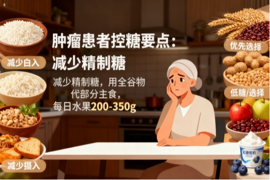 腫瘤患者需控制糖分?jǐn)z入,過多糖分?jǐn)z入會(huì)導(dǎo)致血糖升高,影響身體健康,還可能對(duì)治療和康復(fù)產(chǎn)生不利影響。建議:選擇低糖食物,如無糖酸奶、低糖水果;優(yōu)先選擇升糖較慢的食物,如全谷物、雜豆類,替代部分精米白面。