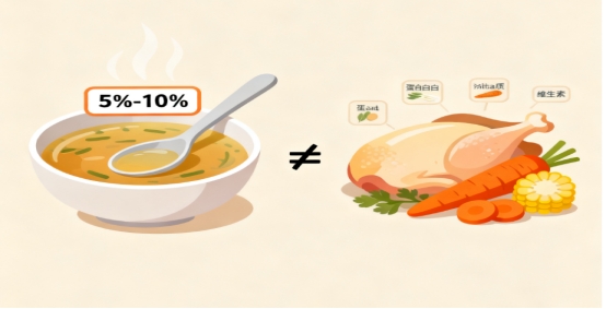 很多人認(rèn)為“喝湯大補(bǔ)”,但實(shí)際湯中營養(yǎng)僅為原料的 5%~10%,湯內(nèi)多為脂肪及少量維生素、礦物質(zhì),大部分營養(yǎng)素(尤其是蛋白質(zhì))仍保留在肉里。若大量喝湯,會(huì)影響其他食物攝入,造成膳食單一,長期下來可能導(dǎo)致患者營養(yǎng)不良。