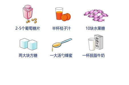 有的糖尿病友在活動量大或者注射胰島素后、口服降糖藥物后未能及時進食時,就會出現頭暈、心慌、手抖、冒冷汗等癥狀;嚴重者因大腦皮質缺乏能量,甚至出現昏迷。這時候就要注意及時補充糖分,以緩解或糾正低血糖癥狀。當出現低血糖時可食用如下圖所示數量的含糖食物,進食15分鐘后癥狀如不能緩解的要及時到醫院就診。