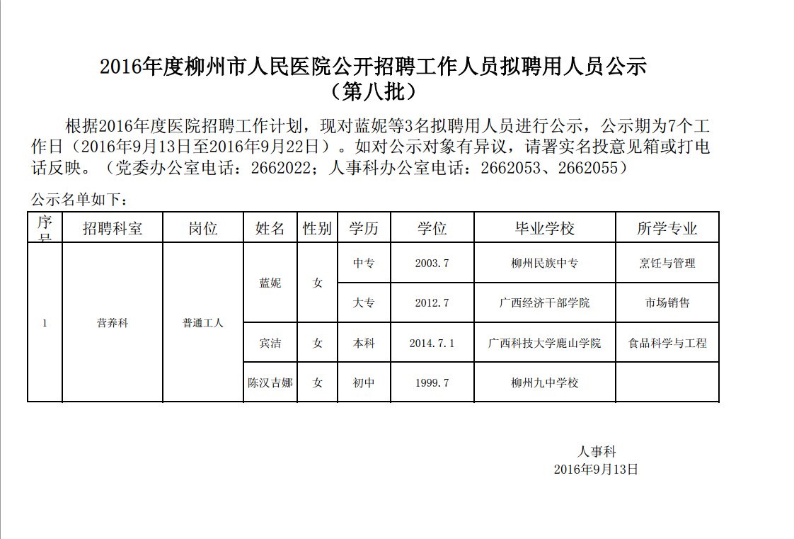2016年度柳州市人民醫(yī)院公開(kāi)招聘工作人員擬聘用人員公示(第八批)