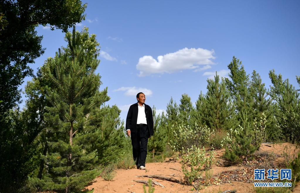 石光銀在自己最早治理的“狼窩沙”林地里(2020年5月30日攝)。新華社記者 劉瀟 攝