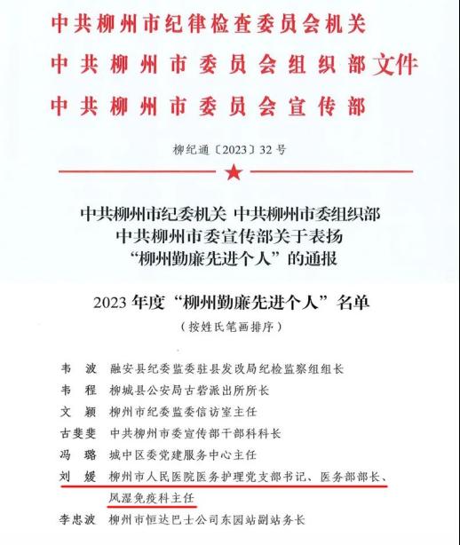 近日,中共柳州市紀委機關、中共柳州市委組織部、中共柳州市委宣傳部發布了關于表揚“柳州勤廉先進個人”的通報,對20名清廉守紀、勤政為民、愛崗敬業、無私奉獻的同志予以表揚,授予“柳州勤廉先進個人”稱號,柳州市人民醫院醫務護理黨支部書記、醫務部部長、風濕免疫科主任劉媛便是其中一員,她也是柳州市衛健系統唯一獲此殊榮的個人。