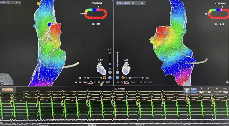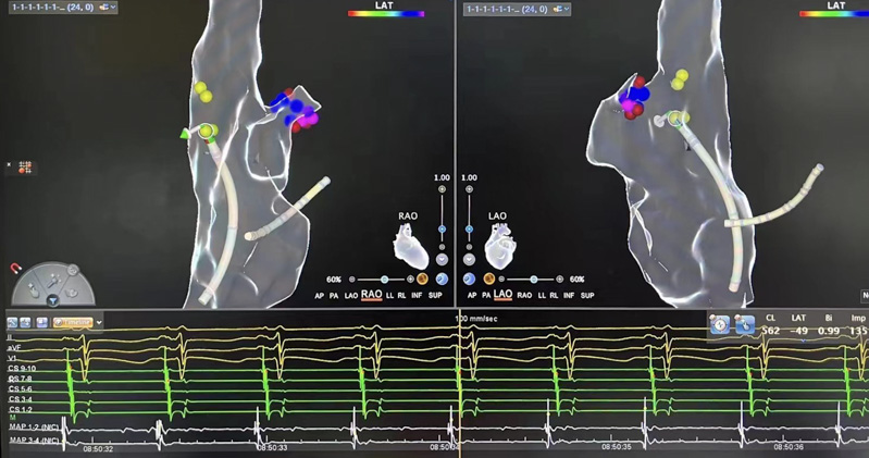 介入室內(nèi),心血管內(nèi)科電生理團隊開始為患者進行心電生理檢查,在三維系統(tǒng)指引下行激動標測提示心律失常起源于右心耳根部。右心耳是右心房的盲端,非常菲薄,大約只有1-2mm,附近有竇房結(jié)、上腔靜脈等重要結(jié)構(gòu),在此處消融,有心臟穿孔、損傷竇房結(jié)導致心臟停搏等風險。