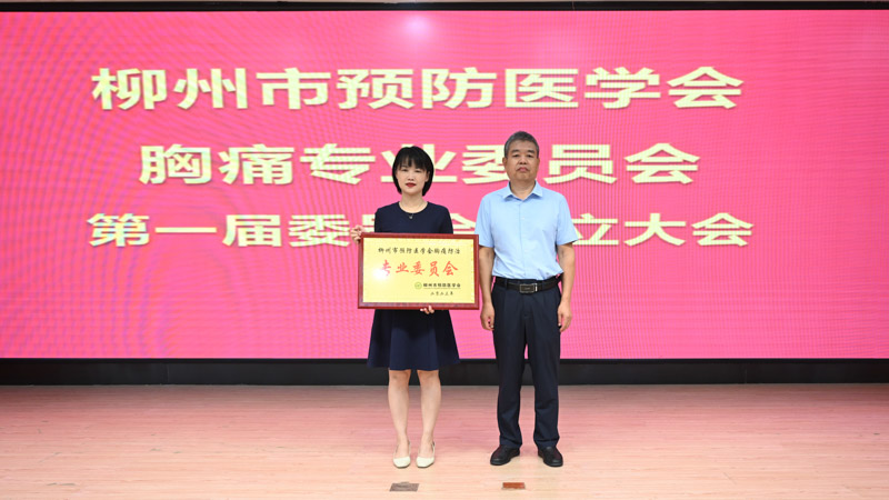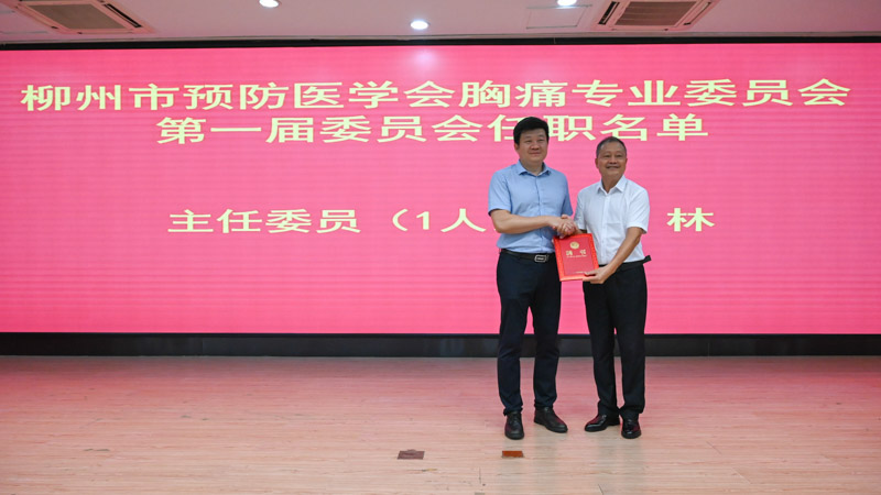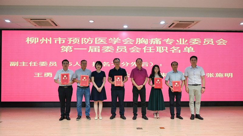 最后,與會領導共同宣布柳州市預防醫學會胸痛專業委員會的成立,并向委員會成員頒發了聘書。任命陶林為主任委員;王勇、楊帆、羅長軍、朱仕現、張施明為副主任委員;譚碧松、吳剛等45位同志為委員;齊彬、沈麗為秘書。