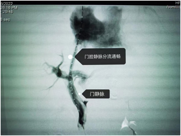 術前,介入團隊精心制定了詳細的手術方案及應急預案,術中大家密切配合,血管外科副主任霍鑫博士經股靜脈,股動脈,頸靜脈進行穿刺,建立門腔分流道,置入支架,造影證實支架血流通暢后,栓塞曲張出血的胃底食管靜脈,拔出穿刺長鞘及血管鞘,穿刺處加壓包扎,手術順利完成。術后患者門靜脈壓力明顯降低,目前患者已成功出院。