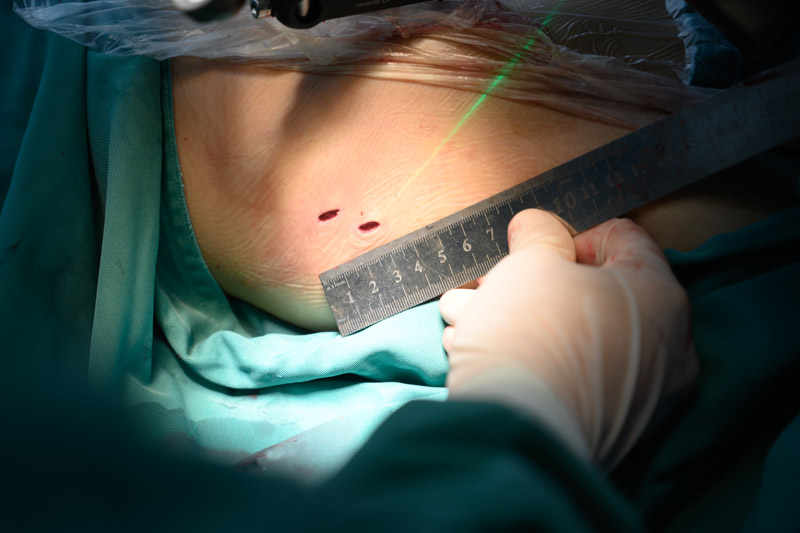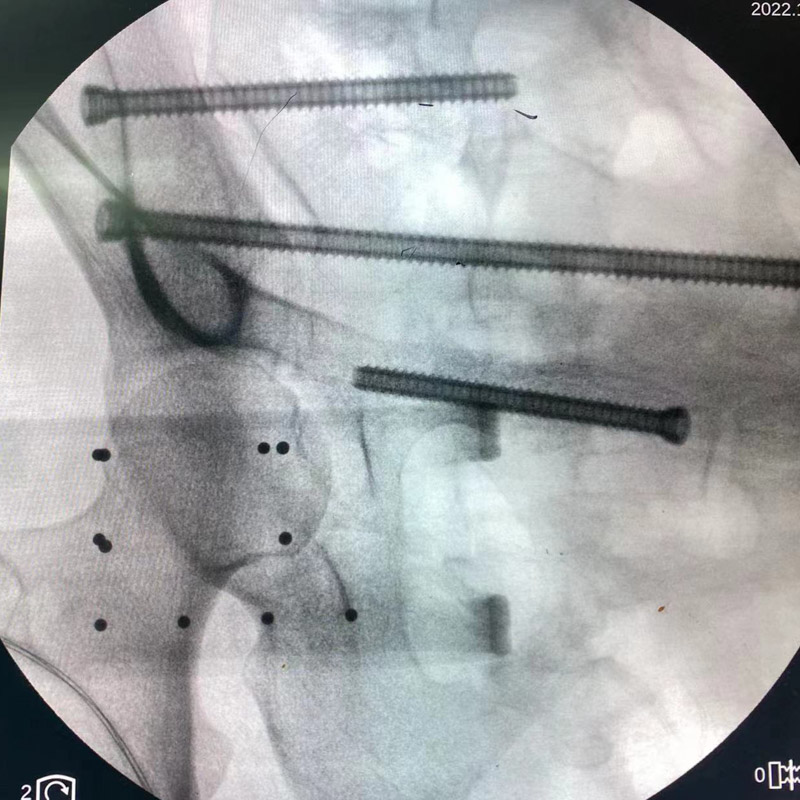 術中,創傷骨科團隊將示蹤器安裝在患者手術處,與移動C型臂X光機相配合,手術團隊根據生成圖像模擬置釘,通過獨有算法計算出入釘點及釘道,按照術中規劃,施術者借助導向套筒,為患者精準的植入三枚螺釘,手術切口僅三個1厘米小洞,術中出血不到10毫升。
