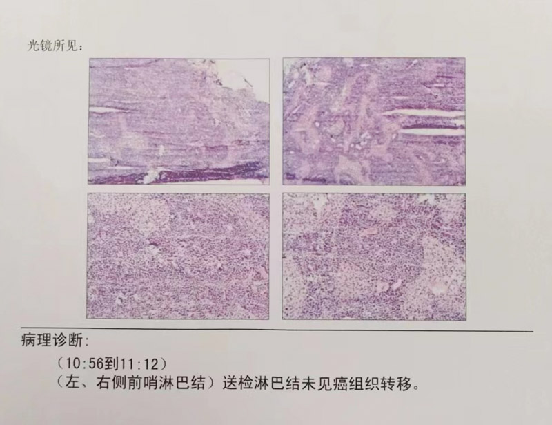 經過充分準備,手術如期進行,吲哚菁綠宮頸注射后盆腔內前哨淋巴結顯影良好,柳州市人民醫院婦科手術團隊在熒光腹腔鏡指示下順利切除左、右盆腔前哨淋巴結送快速冰凍病理檢查。經半小時等待,好消息傳來,快速病理回報左、右側盆腔前哨淋巴結均無轉移!這意味著韋阿姨不需要進行盆腹腔淋巴結系統切除。隨后,陳煜岊主任耐心細致按計劃切除了患者子宮附件,手術圓滿成功。