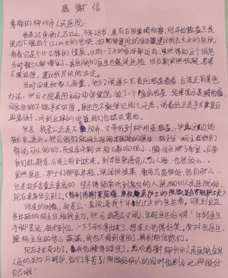 術(shù)后經(jīng)過(guò)醫(yī)護(hù)團(tuán)隊(duì)的精心治療與護(hù)理,患者很快恢復(fù)。患者石女士對(duì)柳州市人民醫(yī)院精湛技術(shù)和高質(zhì)量的服務(wù)贊不絕口,在出院時(shí)精心準(zhǔn)備了一封“沉甸甸”的感謝信送給全體醫(yī)護(hù)人員。