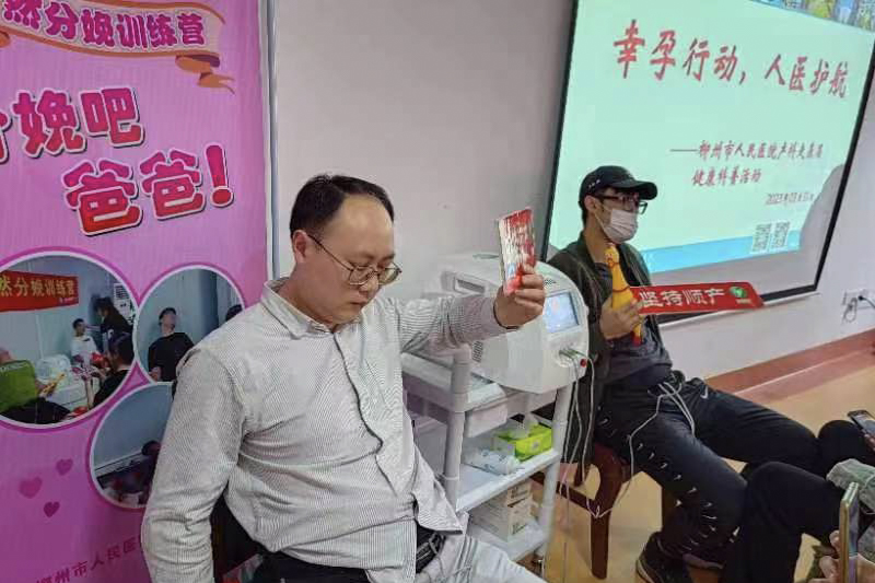 “加油、加油、加油”,在一陣陣吶喊聲中,一場別開生面的男士分娩大賽開始了,準爸爸齊上陣進行分娩陣痛體驗。僅僅過了幾分鐘,準爸爸們就疼得捧腹彎腰,張嘴大喊,扭曲的表情將分娩的痛苦展露無疑。孕婦學校盧連梅老師在一旁不停地指導準爸爸們呼吸,準媽媽們則在準爸爸面前耐心地鼓勁助力。參與活動的準爸爸們紛紛表示,生孩子真的太不容易了,以后要給老婆更多的關愛。