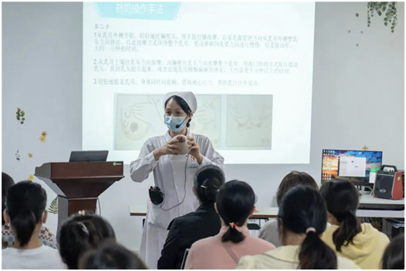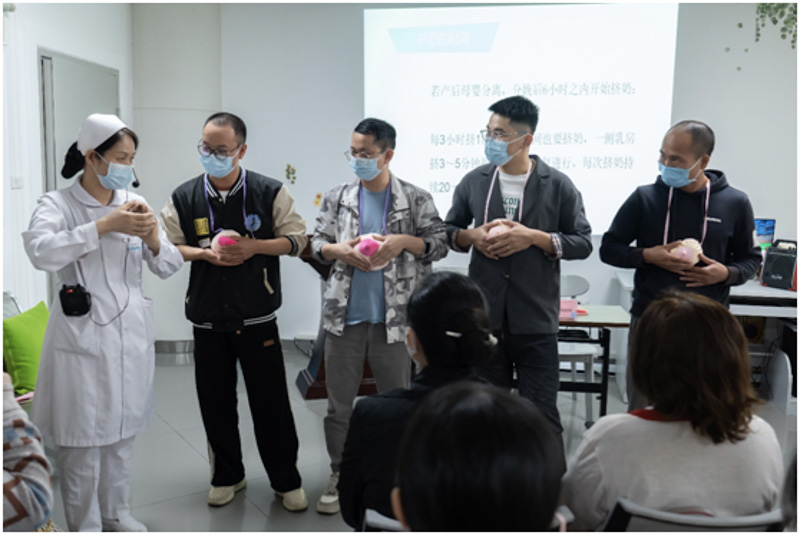 活動中,孕婦學(xué)校盧連梅老師與孕媽媽們交流及分享了正確的擠奶方法,課堂上,老師邀請準(zhǔn)爸爸們上臺體驗擠奶的手法,手把手指導(dǎo)準(zhǔn)爸爸如何正確手?jǐn)D奶。并提醒準(zhǔn)媽媽和準(zhǔn)爸爸們,在產(chǎn)褥期,如果出現(xiàn)生理性漲奶、堵奶的情況,正確的擠奶手法,可以保持乳汁通暢,更好做到母乳喂養(yǎng)。