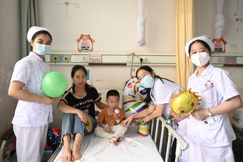 在兒科病區(qū),醫(yī)護人員聯(lián)合志愿者們在病房和走廊都掛上了五顏六色的氣球,為孩子們籌備了一場特別的“節(jié)日盛會”。