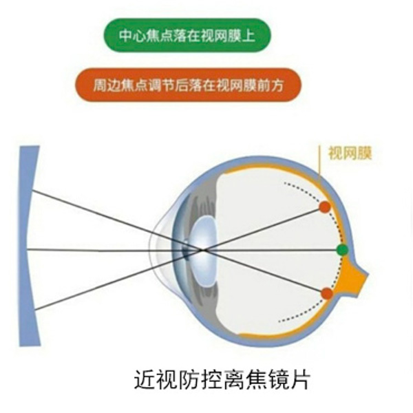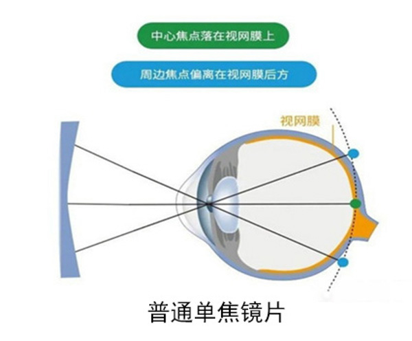 使用普通單焦鏡片矯正近視,影像中心光線可以匯聚到視網膜上,但周邊光線會在視網膜之后成像,因為視網膜感知到光線在后,就會向后生長,長此以往,勢必導致眼軸增長、近視加深。