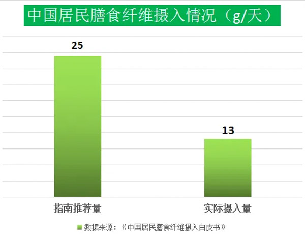 《中國居民膳食纖維攝入白皮書》顯示:中國居民膳食纖維攝入普遍不足,且呈下降的趨勢,目前每日人均膳食纖維約為13克。與《中國居民膳食營養素參考攝入量》中膳食纖維的推薦量相比,能達到適宜攝入量(25克/天)的人群不足5%