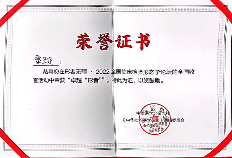 近日,在深圳舉辦的“形者無(wú)疆?2022全國(guó)臨床檢驗(yàn)形態(tài)學(xué)論壇”傳來(lái)好消息,柳州市人民醫(yī)院醫(yī)學(xué)檢驗(yàn)科黎華連副主任技師在“全國(guó)AI挑戰(zhàn)賽”環(huán)節(jié)中成績(jī)排名第二,榮獲“卓越 ‘形者’”榮譽(yù)獎(jiǎng)。