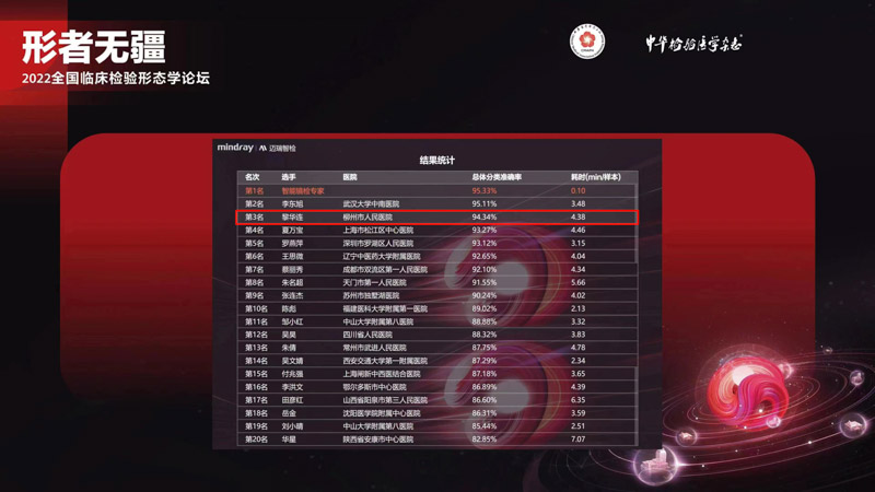 比賽中,經(jīng)過(guò)層層選拔的20位形態(tài)學(xué)高手一較高下,需要在50分鐘內(nèi)完成14道隨機(jī)排序的細(xì)胞分類審核題目,一半樣本獨(dú)立完成,一半樣本則在閱片機(jī)的AI算法助力下完成。最終,柳州市人民醫(yī)院醫(yī)學(xué)檢驗(yàn)科黎華連副主任技師以總體分類94.35%的準(zhǔn)確率和平均耗時(shí)4.38min/樣本的好成績(jī),榮獲全國(guó)排名第二的“卓越‘形者’”榮譽(yù)獎(jiǎng)。