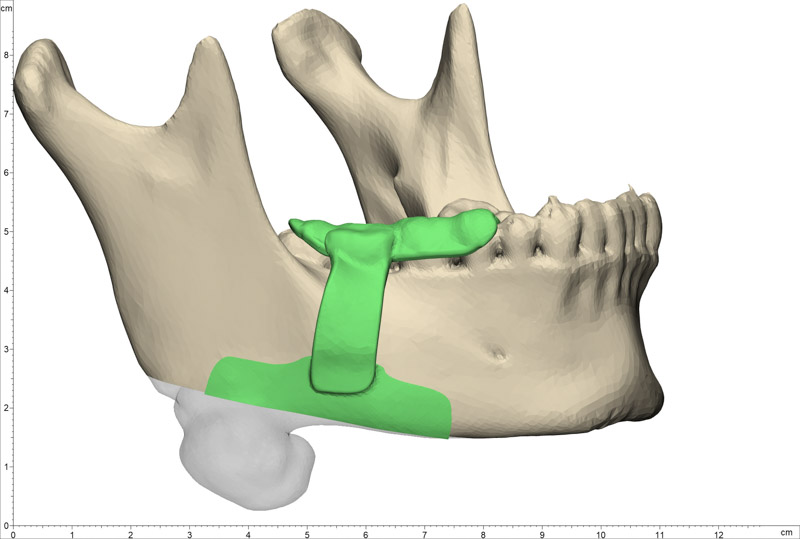 為保障患者安全,在多次病例討論后,口腔科手術(shù)團(tuán)隊(duì)做了多次術(shù)前評(píng)估,并設(shè)計(jì)了精密的3D打印截骨導(dǎo)板。術(shù)中,劉彥杰醫(yī)生利用導(dǎo)板引導(dǎo)精確進(jìn)行截骨,順利從口內(nèi)將腫物切除。