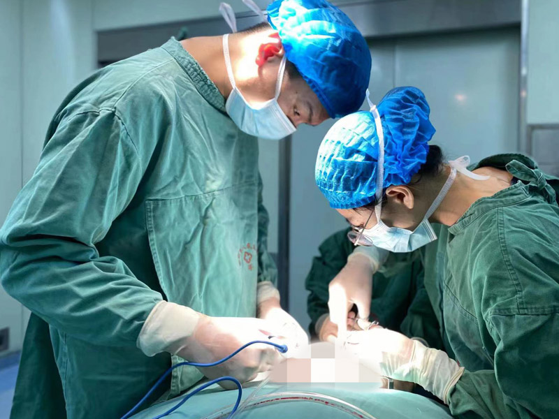 為了解決楊阿婆的難題,口腔科團隊開展了聯合診療,仔細討論后制定了完善的治療方案。手術將分兩期進行,第一期手術將惡變的一部分切除,形成的大面積缺損使用左側腹部全厚皮片修復;第二期手術在第一期手術后三個月進行,切除另一部分病變,并切除外耳道病變,外耳道的缺損使用右側下腹部的全厚皮片修復。由于耳朵部位結構復雜,植皮后需要用VSD持續吸引,可以增加皮片存活率。