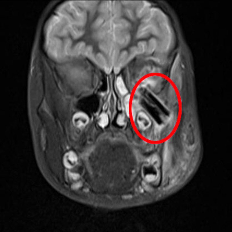 接診醫生得知患兒曾摔跤受傷,便推斷傷口可能有異物殘留,立即安排其入院進行詳細檢查。檢查發現樹枝從面部直插顳下窩至眼球后方,還有零星碎片斷在顱底,導致眼球位移,面頰部、鼻部、眼部感染,情況不容樂觀。