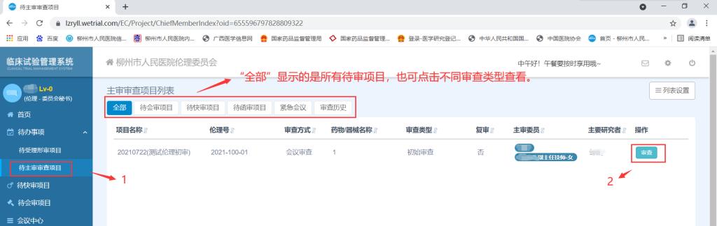 2.1點擊“待辦事項”下的“待主審審查項目”可以看到自己負責主審的項目,然后點擊“審查”進入該項目的審查界面。(如下圖)