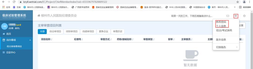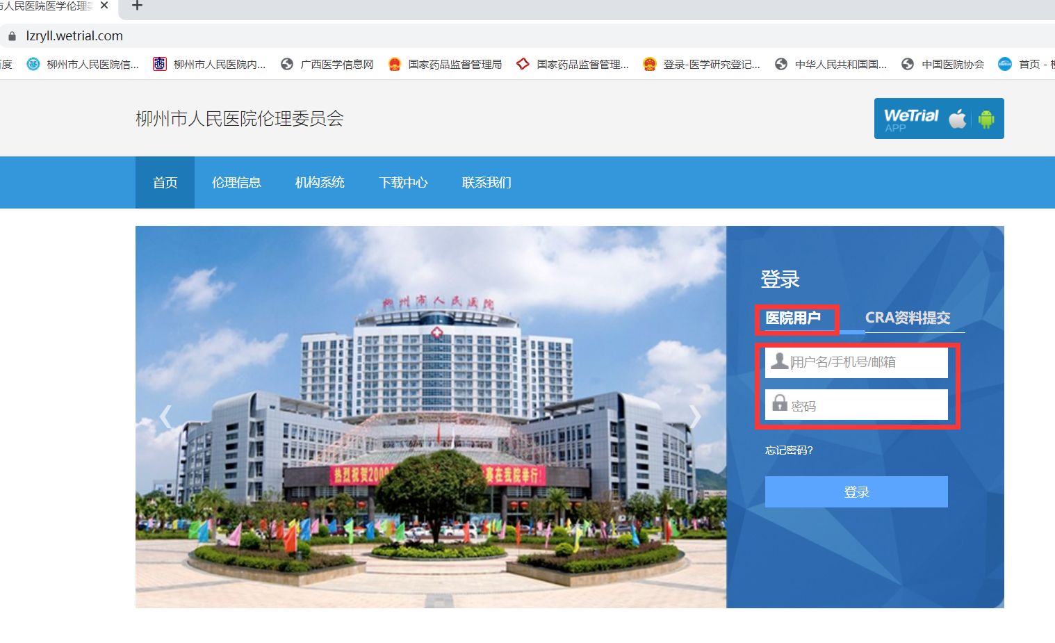 1.1登陸:下載谷歌瀏覽器(由于系統的兼容性,其它360、IE等瀏覽器有可能導致網頁出現亂碼或打開不暢的問題),在瀏覽器地址欄輸入柳州市人民醫院倫理委員會審查系統的網址(https://lzryll.wetrial.com/),從“醫院用戶”入口使用各人賬號及密碼登陸系統。(如下圖)