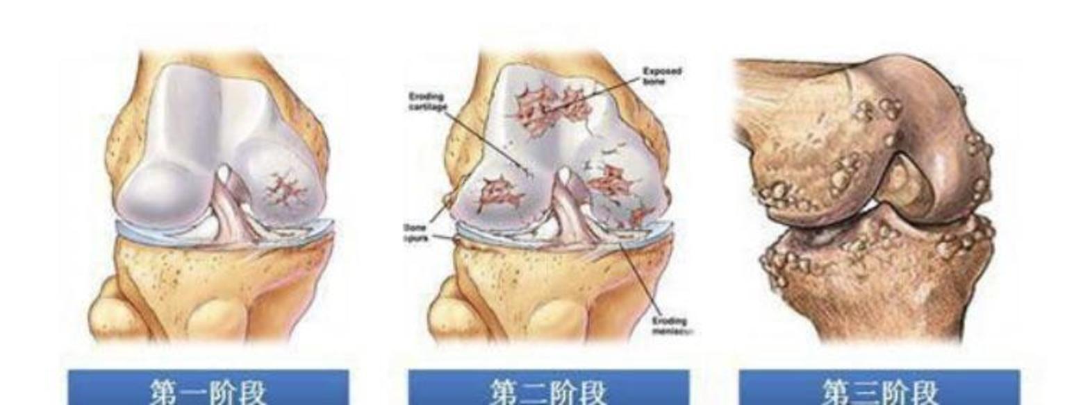 膝關節骨性關節炎包括關節周圍骨質增生、軟骨退變、關節畸形、滑膜增生等等。如圖中原本光滑的軟骨,逐漸退變脫落,漏出粗糙的硬化骨,在活動時,這些粗糙的骨面之間摩擦就是發出低沉的、咯拉拉的摩擦音。