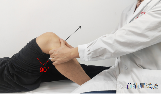前抽屜試驗。患者平臥,髖關節屈曲 45°,膝關節屈曲 90°,放松下肢肌肉。檢查者坐在患者足部(方便固定其下肢),雙手握住其脛骨上段向前牽拉。可以跟健側進行對比。