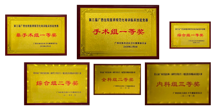 在歷屆廣西住培臨床技能競賽中,我院參賽學員榮獲一等獎三次、二等獎兩次、三等獎一次和一個最佳選手獎的好成績,多名學員獲得自治區“優秀住培學員”榮譽稱號。