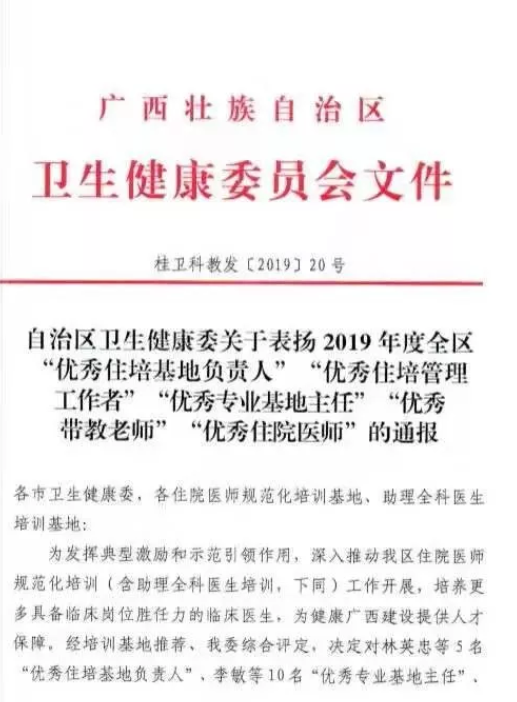 近日,自治區衛建委印發了《自治區衛生健康委關于表揚2019年度全區“優秀住培基地負責人”“優秀住培管理工作者”“優秀專業基地主任”“優秀帶教老師”“優秀住院醫師”的通報》。我院潘光棟副院長獲“優秀住培管理工作者”,陳麗榮、王棟棟獲“優秀帶教老師“,郭藝獲”優秀住院醫師“。